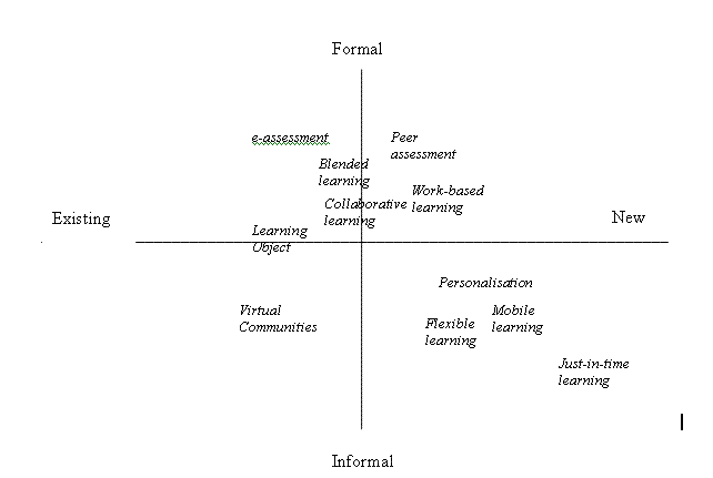 - Did you find any of the concepts difficult to place on the grid provided? If so, why was this? Placement on the grid is dependant on the concept’s definition. Also for me it was not clear what is understood by ‘New’. For who is it new? For the organisation, learning in general, myself? As mentioned by the course team in the activity’s introduction, elearning is a broad umbrella term. Elearning is a broad area which as shown through this graph may include formal or informal experiences. The same technology may be used in different scenarios, aiming for totally different outcomes. Through the graph it can be visualised how concepts related to elearning are biased towards ‘New’ and ‘Informal’. This due to it still being a recent area where innovative ideas emerge at a rapid pace.